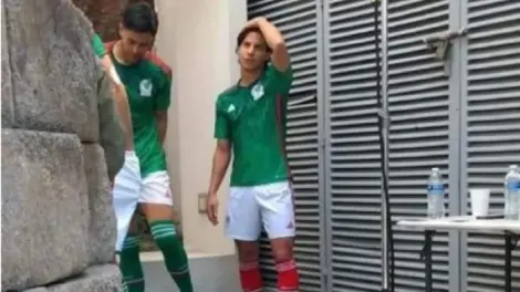 En la imagen filtrada se puede a ver a Diego Laínez portando la combinación tradicional del jersey verde, short blanco y calcetas rojas, que hace alusión a los colores de la bandera de México, mientras que Alfredo Talavera se diferencia por una medias verdes.