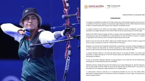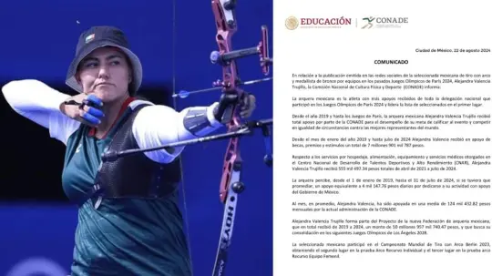 Luego de que la arquera mexicana Alejandra Valencia, medallista en los Juegos Olímpicos de París 2024, denunciara de manera pública que la beca que le otorga la Comisión Nacional del Deporte (Conade) fue reducida, la institución emitió un comunicado en respuesta a lo publicado por la atleta.