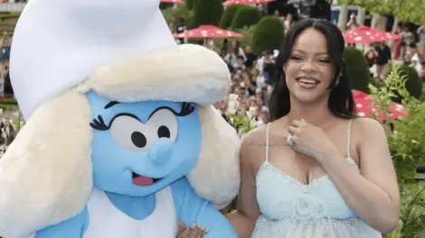 Rihanna acaparó todos los reflectores este sábado en Bruselas al presumir su embarazo durante el estreno mundial de la nueva película 'Los Pitufos'. La estrella barbadense, de 37 años, desfiló por la alfombra azul luciendo un elegante vestido de malla turquesa que dejaba ver su creciente pancita, mientras saludaba a fans y posaba sonriente junto a una figura viviente de Pitufina, personaje al que da voz en la cinta.
