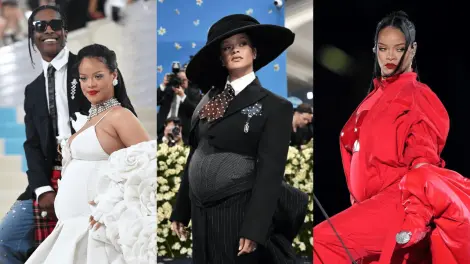 Rihanna hizo una revelación igualmente mediática de su anterior embarazo en 2023, mientras actuaba en el espectáculo de medio tiempo del Super Bowl, en esa ocasión esperaba a su hijo Riot. Asistió a la Gala del MET más tarde ese año, antes de dar a luz.