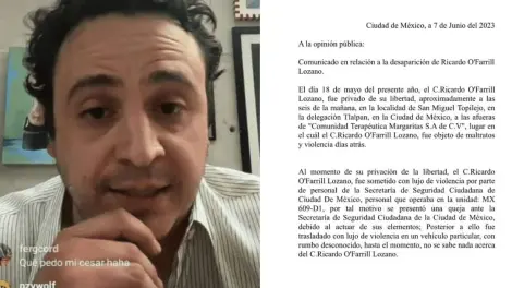 "Al momento de su privación de la libertad, el C. Ricardo O'Farrill fue sometido con lujo de violencia por parte de personal de la Secretaría de Seguridad Ciudadana de la Ciudad de México, personal que operaba en la unidad: MX 609-D1, por tal motivo se presentó un aqueja ante la Secretaría de Seguridad Ciudadana de la Ciudad de México, debido al actuar de sus elementos; Posterior a ello fue trasladado con lujo de violencia en un vehículo particular, con rumbo desconocido, hasta el momento no se sabe nada acerca del C. Ricardo O'Farill Lozano", se lee en el comunicado publicado en la cuenta de Instagram.
