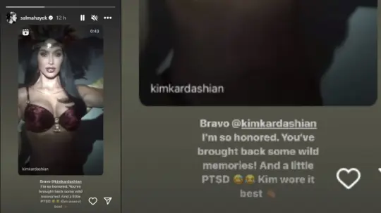 Kim reaccionó al halago y contestó en sus historias de Instagram a la actriz: "Por Dios, reina, @salmahayek. No hay NADIE COMO TÚ. Mi inspiración para siempre".