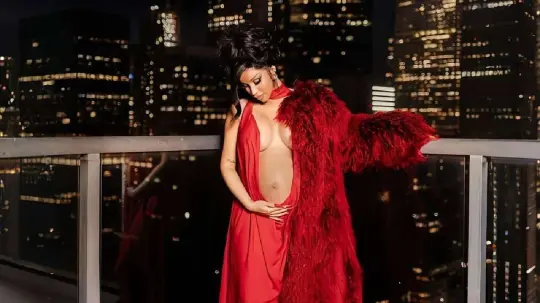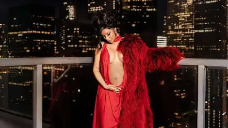 La intérprete de "WAP" fue quien compartió la noticia a través de sus redes sociales, al publicar una foto donde se le ve lucir un vestido con una enorme abertura que deja al desnudo parte de su torso. Es así como enseña su abultado vientre de embarazo con el que confirma que se convertirá en madre por tercera ocasión.