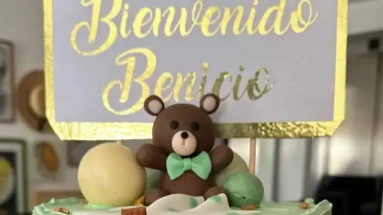 En las fotografías aparece su esposo Matías Aranda sosteniendo al recién nacido, así como una imagen de sus huellas y un pastel con el texto: "Bienvenido Benicio".