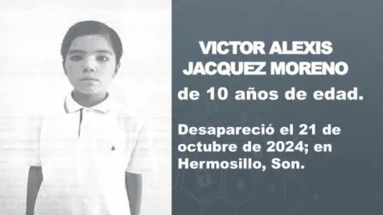 La tarde de este martes, la Fiscalía General de Justicia del Estado de Sonora (Fgjes) informó de la activación de la Alerta Amber para la búsqueda y localización de Víctor Alexis Jacquez Moreno, menor de 10 años de edad desaparecido en Hermosillo.
