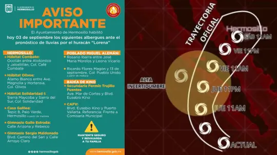 Ante el pronóstico de fuertes lluvias por el huracán "Lorena", el Ayuntamiento de Hermosillo anunció esta tarde la habilitación de albergues en Centros Hábitat en la ciudad, así como en el Poblado Miguel Alemán y en Bahía de Kino.