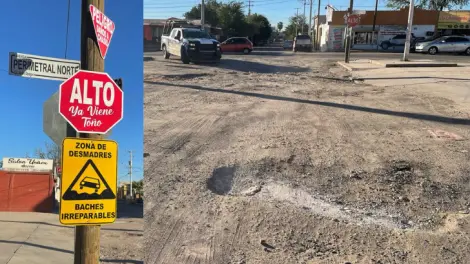 HERMOSILLO, SON.- "Peligro, daños a chasis", "Alto, ya viene Toño", "Zona de desmadres" y "Baches irreparables", son las advertencias que vecinos de la colonia Álvaro Obregón colocaron en la esquina de las calles Perimetral Norte y República de Belice, una vialidad intransitable, llena de hoyos.