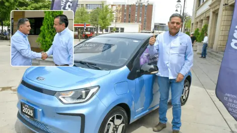 El contribuyente Fernando Sabori Montijo tuvo un día afortunado por cumplir con su pago del predial del año 2025, ya que recibió, de manos del presidente municipal, Antonio Astiazarán Gutiérrez, las llaves del automóvil eléctrico que se ganó por ser un hermosillense cumplido.