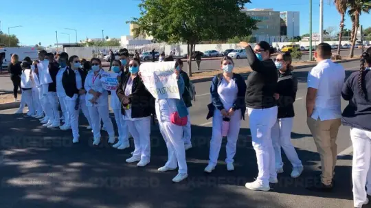Alrededor de 200 elementos del personal de enfermería del Hospital General de Especialidades del Estado de Sonora se manifestaron por fuera de la institución para exigirles a las autoridades de salud su basificación, mejora en el sueldo y seguro social, así como transparencia en el proceso de entregar bases a las y los trabajadores de la salud.
