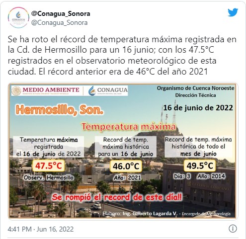 En un tuit publicado por la La Comisión Nacional del Agua Sonora (@Conagua_Sonora) también dio a conocer que el registro que se tiene por el organismo para el día mas caluroso de un mes de junio sigue siendo el alcanzado el día de 3 del mencionado mes pero en 2014, cuando se llegó a la cifra de 49.5 grados.