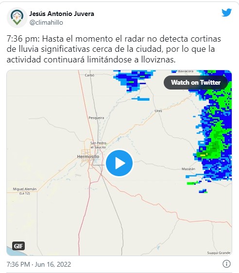 Por su parte, el experto en meteorología, Jesús Antonio Juvera (@ClimaHillo) advirtió desde el inicio de esta semana que la presencia significativa de lluvia en Hermosillo podría estar presentándose entre este jueves 16 y el viernes 17 de junio.
