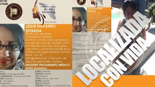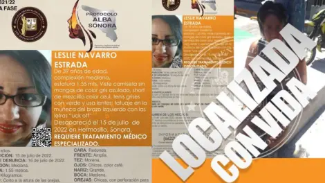La Fiscalía de Sonora (FGJE Sonora) dio a conocer este jueves la localización con vida y en situación de calle de la fémina Leslie Navarro Estrada, reportada como desaparecida el 15 de julio y por la cual se había activado la segunda fase de la Alerta de Protocolo Alba Sonora.