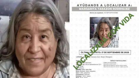 La Comisión de Búsqueda de Personas para el Estado de Sonora informó que Margarita Tarazón Rodríguez, adulta mayor que fue reportada como desaparecida en la ciudad de Hermosillo, fue encontrada con vida.
