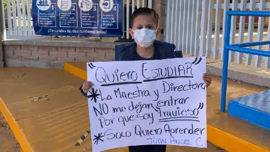 Scarlett Paola Ríos, madre del menor, publicó en redes una fotografía que se hizo viral en la que el pequeño sostiene un cartel en el que señala: “Quiero estudiar. La maestra y directora no me dejan entrar porque soy travieso. Solo quiero aprender”.