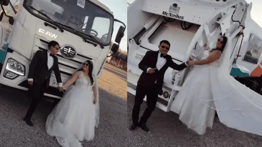 María Angulo y Luis Enrique Balcázar, trabajador de Servicios Públicos Municipales, celebraron su enlace matrimonial con una sesión de fotos junto a un camión recolector de basura, la tarde del pasado viernes 15 de diciembre en el Parque La Ruina.