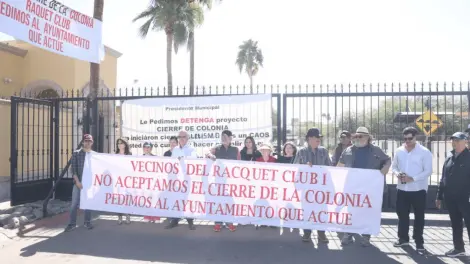 Varias familias de la colonia Raquet Club salieron a las calles a manifestar su inconformidad por la instalación de rejas de acceso controlado en la entrada de la calle Waterpolo.