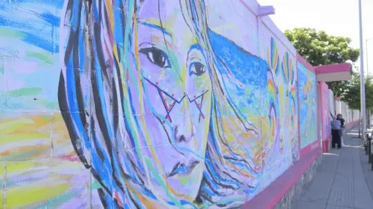 Roberto Villalobos Rascón pinta por iniciativa propia las bardas de la escuela Secundaria 24 Profesor Alejandro Sotelo Burruel de Hermosillo Sonora, en sus murales se pueden ver una adolescente Comca'ac, tortugas marinas y colibríes