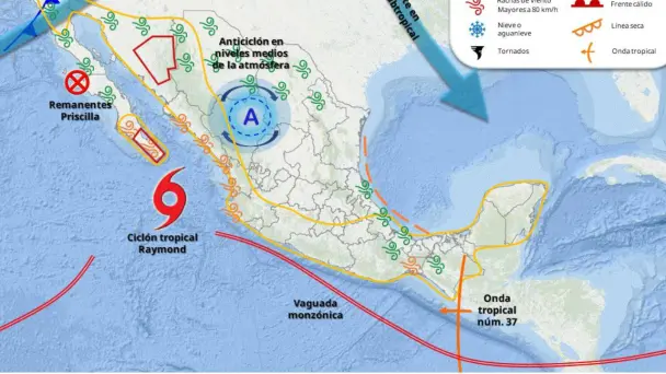 Simultáneamente, un frente frío ingresará por el norte de Baja California, reforzando las condiciones para lluvias y actividad eléctrica en Sonora y otros estados del noroeste. Autoridades recomendaron extremar precauciones en zonas vulnerables y evitar actividades en cuerpos de agua.