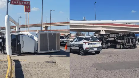 Un vehículo de carga volcó sobre el bulevar Solidaridad al intentar ingresar a una plaza comercial e impactar contra la portería de contención de la entrada.