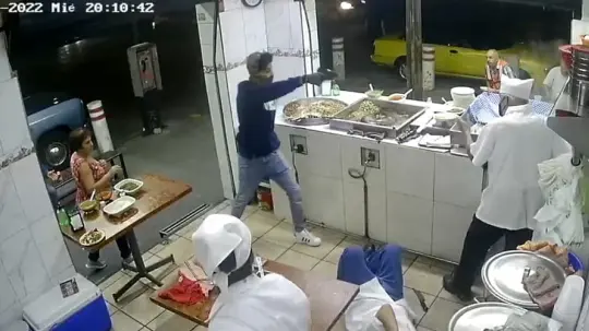 Al mismo tiempo, uno de los sujetos amenaza a los clientes que se encuentran afuera de la taquería.