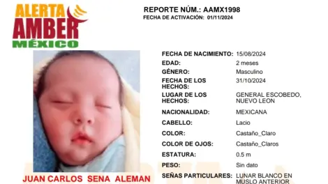 La Fiscalía General de Justicia de Nuevo León emitió una Alerta Amber tras el secuestro de un bebé de tres meses de edad en el municipio de Escobedo.