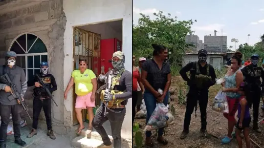 En redes sociales circularon videos donde se observa a personas armadas, con uniformes tácticos y pasamontañas, descargando bolsas de víveres desde una camioneta mientras habitantes forman filas para recibir la ayuda.