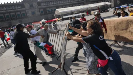 Este domingo 19 de mayo, la CNTE e integrantes de la Marea Rosa llegaron a los golpes al no dejarlos pasar en un primer momento en la plancha del Zócalo capitalino.