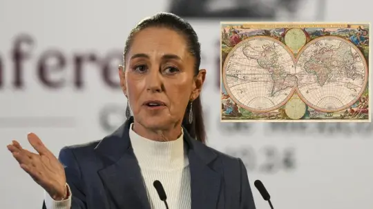 Durante la conferencia, el secretario José Alfonso Suárez del Real mostró un mapamundi histórico para enfatizar que el término "América Mexicana" tiene raíces cartográficas desde el siglo XVII. Según Suárez del Real, este concepto resalta la influencia histórica y cultural de México en el continente.