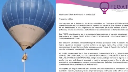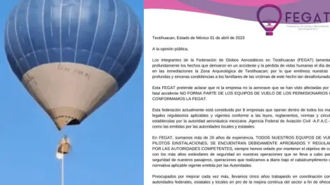 Se emitió un comunicado por parte de la Federación de Globos Aerostáticos en Teotihuacán (FEGAT), donde expresaron su preocupación y lamento por los hechos que derivaron en un accidente y la pérdida de vidas humanas hoy en la mañana.