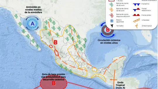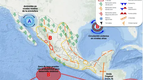 En tanto, una zona de baja presión con probabilidad para desarrollo ciclónico se desplazará al suroeste de las costas de Michoacán y Colima, propiciando lluvias fuertes con descargas eléctricas en dichas entidades, además de Guerrero y Jalisco.
