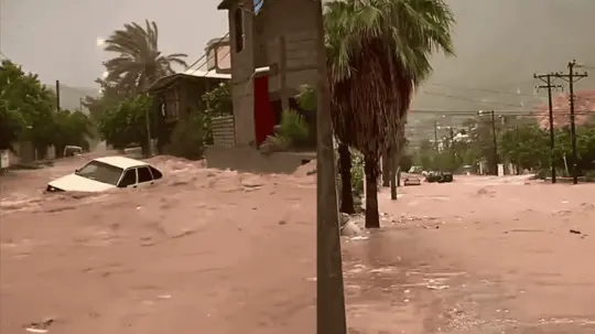 En Baja California Sur, el paso de la tormenta dejó decenas de colonias inundadas y sin servicio de agua potable ni luz, árboles y postes de luz caídos, embarcaciones siniestradas, crecida de arroyos y un menor de edad electrocutado.