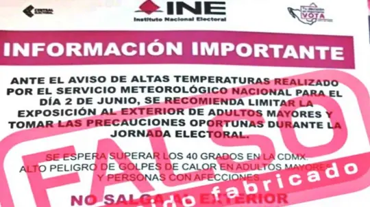 El Instituto Nacional Electoral (INE) desmintió la información de un supuesto panfleto donde se recomienda a la ciudadanía no salir a votar debido a las altas temperaturas. A través de la cuenta de X de la iniciativa para combatir la desinformación Certeza INE, el organismo escribió: