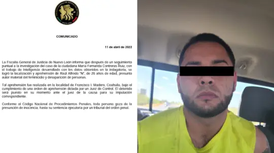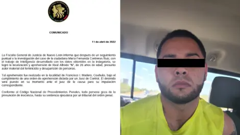 CIUDAD DE MÉXICO.- La Fiscalía General de Justicia del estado de Nuevo León informó de la detención de un hombre, identificado como Raúl Alfredo "N", de 26 años, como presunto responsable del delito de feminicidio y desaparición de María Fernanda.