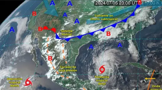 Durante este sábado, las bandas nubosas de la ahora tormenta tropical Beryl ocasionarán lluvias muy fuertes en Campeche, Tamaulipas, el norte de Veracruz y Yucatán. Se prevén lluvias fuertes en Quintana Roo y viento con rachas de 50 a 70 kilómetros por hora (km/h), el oleaje será de 1 a 3 metros (m) de altura y habrá posibles trombas marinas en costas de Campeche, Tabasco, Tamaulipas, el norte de Veracruz y Yucatán.