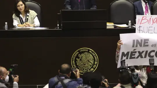 En video, mexicanos en Madrid, mostraron carteles en favor del Instituto Nacional Electoral (INE), tachando además, con cánticos al presidente López Obrador de "traidor".