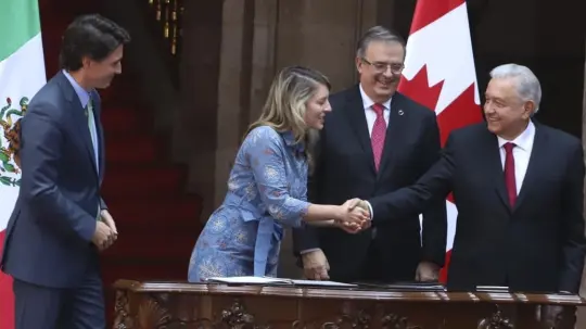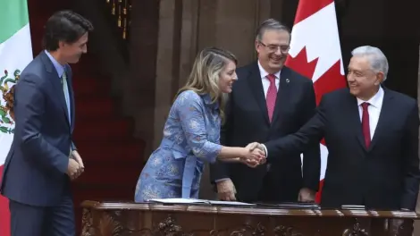 En el Patio de Honor de Palacio Nacional, el presidente Andrés Manuel López Obrador y el primer Ministro de Canadá, Justin Trudeau, fueron testigos de honor de la firma de memorándum suscrito por el canciller Marcelo Ebrard y la ministra de Asuntos Exteriores de Canadá, Mélanie Joly.