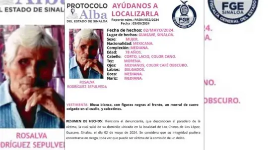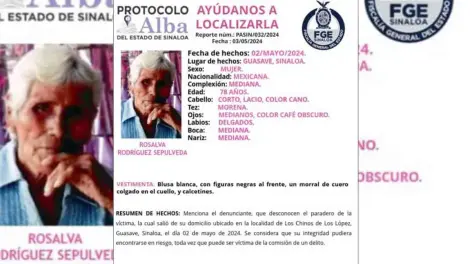 Se desactivó la ficha de búsqueda de la señora Rosalba Rodríguez Sepúlveda de 78 años de edad, reportada como desaparecida desde el pasado jueves 2 de mayo, al ser localizado su cuerpo en una parcela de la comunidad de Los Chino de los López, en la sindicatura de Nío, municipio de Guasave.