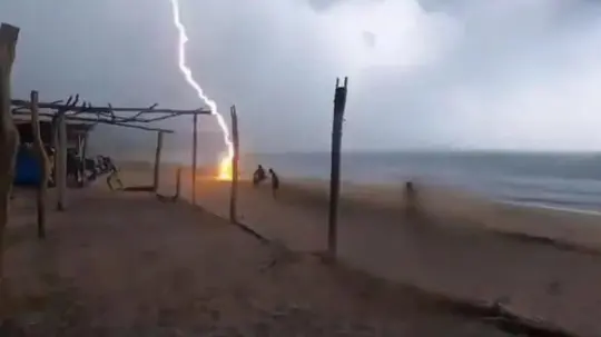 En internet se ha viralizado un video en el que se muestra el momento exacto en el que dos personas que transitaban en una de las playas de Aquila, en Michoacán son alcanzados por un rayo.