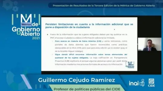 En la publicación de dicho estudio, el Profesor de Políticas Públicas de CIDE, Guillermo Cejudo Ramírez, destacó que se perdió la tendencia positiva en la apertura gubernamental. Detalló que dos factores entorpecieron la experiencia ciudadana en apertura gubernamental: la rotación de personal asociada a los cambios de gobierno en un año con elecciones federales y locales, y la pandemia por Covid-19.