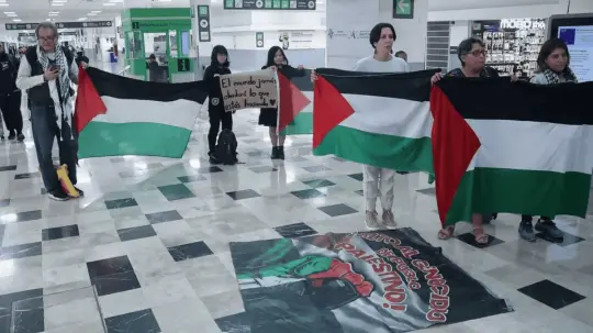 Antes de partir, se manifestaron con consignas como: "¡Libertad para el pueblo palestino!" y "¡A romper relación con Israel", en la Puerta 7 de la Terminal 1 del AICM, mientras ondeaban banderas de Palestina y sostenían una manta donde se leía "Alto al genocidio del pueblo palestino".