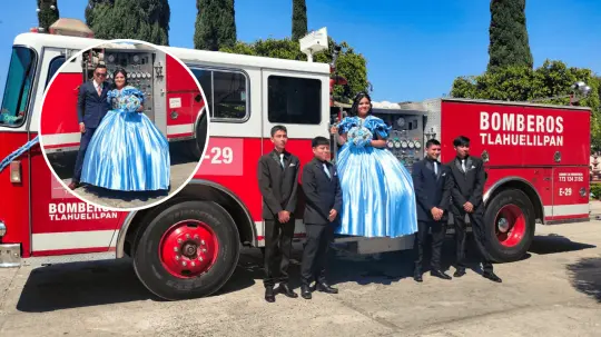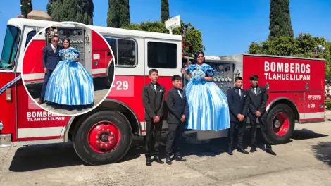 Vestida con un hermoso vestido azul con detalles en gris, Michelle posó junto al camión de bomberos estacionado en un costado de la plaza principal de Tlahuelilpan. El vehículo, adornado con moños azules a juego con el color de su vestido, sirvió como telón de fondo para una sesión fotográfica llena de amor y admiración hacia su padre.