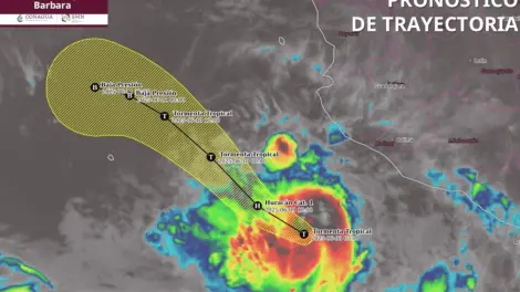 La tormenta tropical Barbara se ubicará este lunes frente a las costas de Jalisco como posible huracán categoría 1 en la escala Saffir-Simpson. Sus bandas nubosas provocarán condiciones severas en el occidente del país, con lluvias fuertes, rachas de viento de hasta 80 km/h y oleaje elevado de 4 a 5 metros en Jalisco, Colima y Michoacán. En Nayarit, se esperan chubascos, vientos de hasta 60 km/h y oleaje de 2.5 a 3.5 metros.