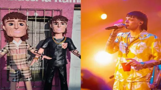 En las fotos de las piñatas de Peso Pluma, muestran la figura hecha de cartón con el característico corte de cabello mullet del intérprete de corridos tumbados, así como los lunares en el rostro.