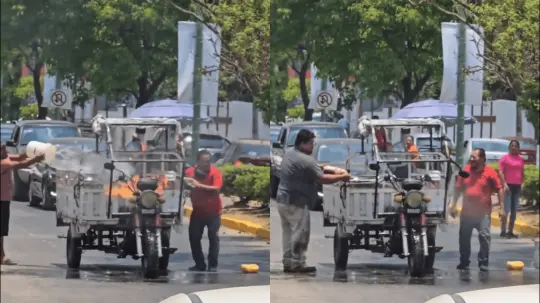 Un hombre intentaba mitigar un incendio en una motocicleta de carga con cubetazos de agua y un trapo mojado sin éxito, hasta que otro sujeto roció un refresco Coca-Cola contra las llamas y logró apagar el fuego por completo.