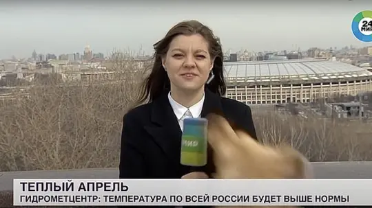 Durante un reporte del clima transmitido en vivo en Moscú, un perro interrumpe la cadena tomando el micrófono con el hocico.