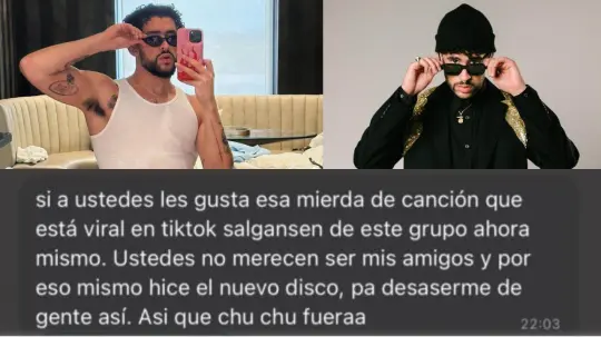 "Si a ustedes les gusta esa mierda de canción que está viral en tiktok salgansen de este grupo ahora mismo. Ustedes no merecen ser mis amigos y por eso mismo hice el nuevo disco, pa desaserme de gente así. Así que ch uchu chu fueraa (sic)", escribió el cantante en su canal de WhatsApp.