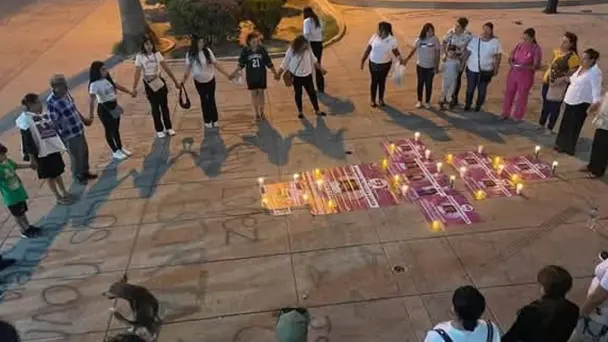 Durante la protesta, asistentes encendieron veladoras, colocaron pancartas en la plaza Benito Juárez, elevaron oraciones y demandaron justicia para que los tres hombres regresen a casa.