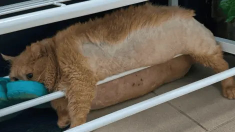 Viral gato de 17 kilos intenta escapar de su rehabilitación y queda atorado