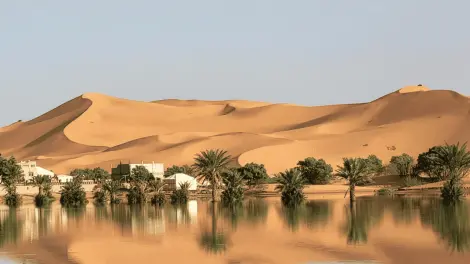 Una sorprendente serie de chaparrones ha transformado el árido paisaje del desierto del Sahara, formando lagos entre las dunas y palmeras, después de que algunas de sus regiones más secas recibieran lluvias sin precedentes.