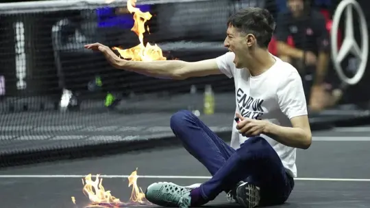 Durante un partido en la Rod Laver Cup, un activista prendió fuego a su brazo como protesta contra los aviones particulares que se utilizan en gran Bretaña.